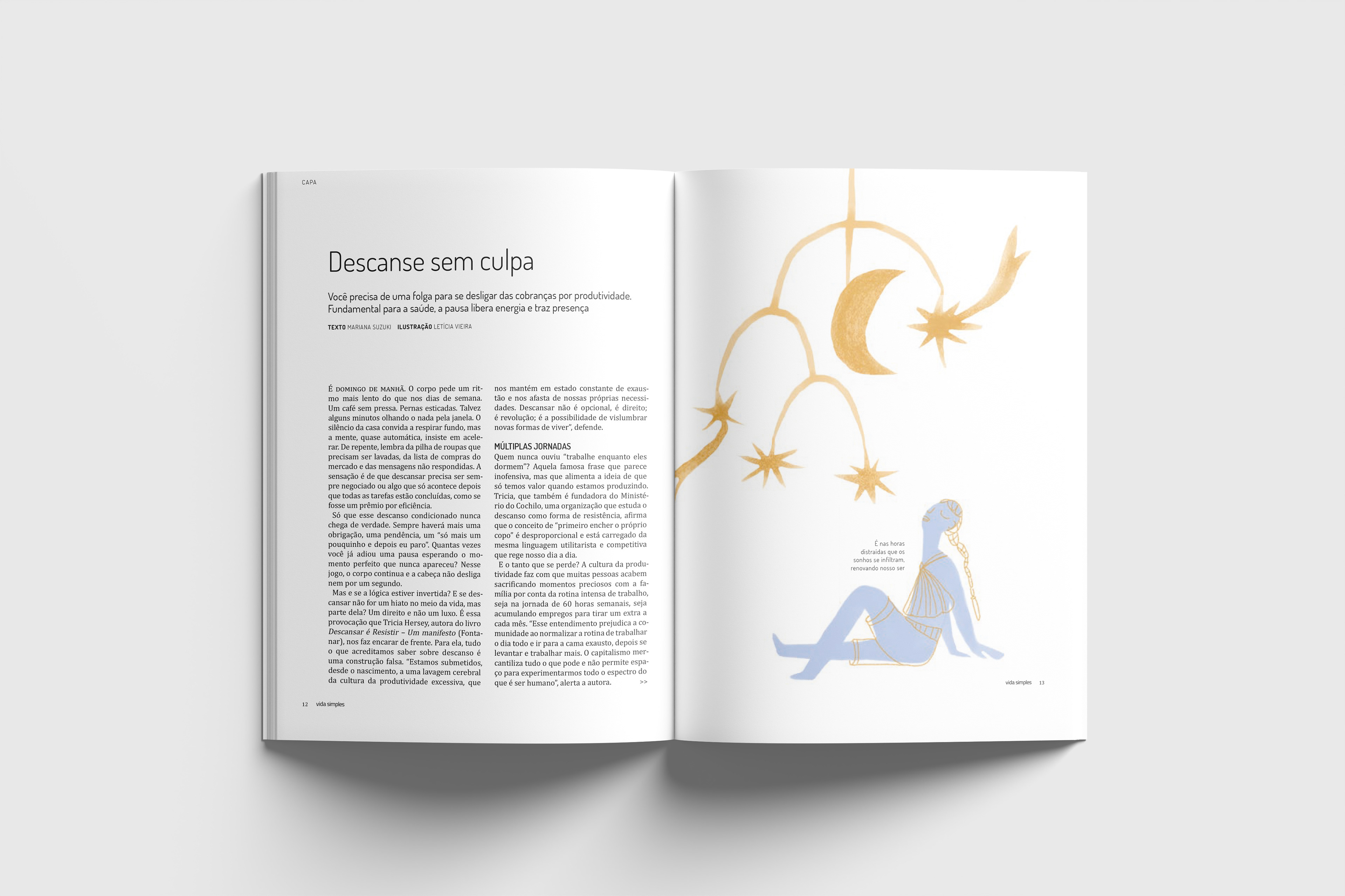 In the October edition of Vida Simples magazine (@vidasimples), I had the pleasure of creating the illustrations for the cover story “Rest Without Guilt.” The text was written by Mariana Suzuki.